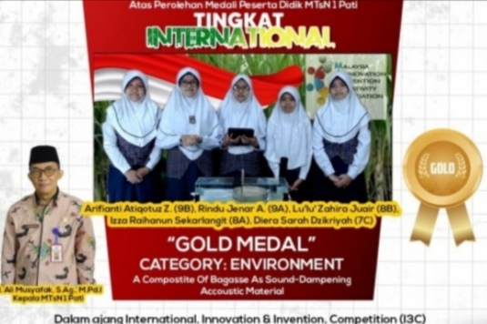 Kepala MTsN 1 Pati, Ali Musyafak, bersyukur atas perolehan medali emas pertama tingkat internasional bidang riset yang diraih anak didiknya.