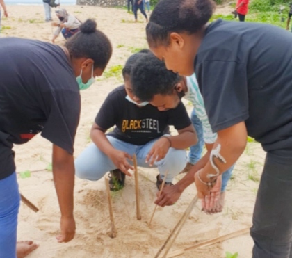 Kegiatan ini diselenggarakan bersamaan dengan aksi bersih pantai yang rutin dilakukan pokdarwis setempat.