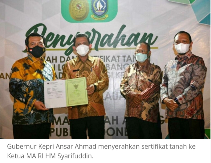 Gubernur Kepri H. Ansar Ahmad sudah menyerahkan tanah dan sertifikat tanah calon lokasi pembangunan Pengadilan Tinggi Kepri dari Pemprov Kepri kepada Ketua Mahkamah Agung (MA) RI H.M. Syarifuddin di Natra Bintan, Jumat (28/1) malam. Untuk sertifkat tanah hibah yang diperuntukkan bagi Pengadilan Tinggi Agama Kepri masih dalam proses penyelesaian.