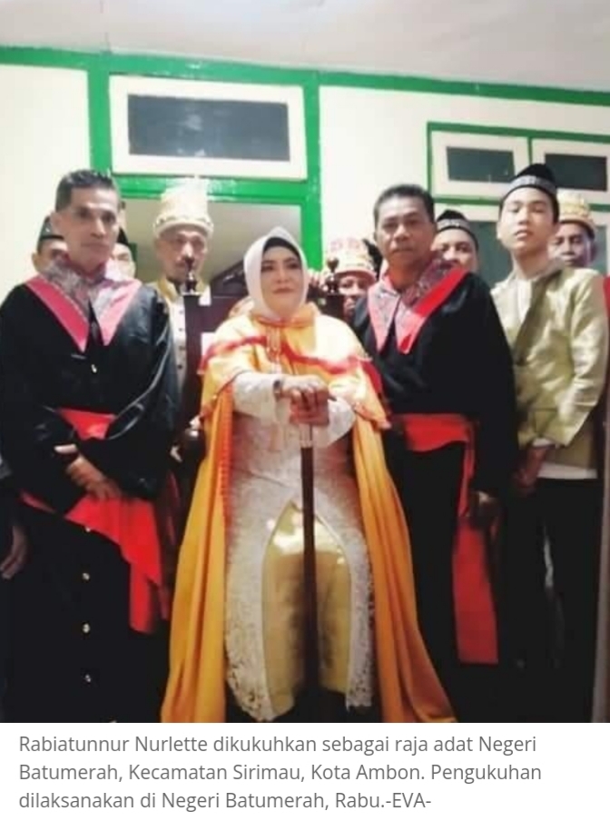 AMBON–Rabiatunnur Nurlette dikukuhkan sebagai raja adat Negeri Batumerah, Kecamatan Sirimau, Kota Ambon. Pengukuhan dilaksanakan di Negeri Batumerah, Rabu (30/3/2022).