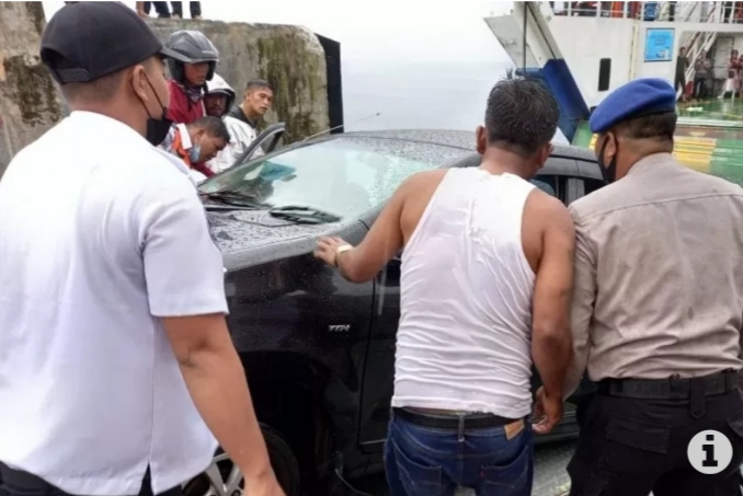 Personel Pos Pelabuhan Ambarita dibantu masyarakat dan yang lainnya mencoba mengikat mobil tersebut dengan menggunakan tali.Namun beban mobil itu terlalu berat menyebabkan mobil tersebut menggantung di rampdoor kapal.dan kepala mobil ke arah atas.