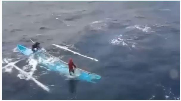 Terlihat sebuah kabal dengan banyak orang berusaha menolong 2 nelayan tersebut, salah satu orang melompat dengan membawa pelampung dan menolongnya, setelah naik merenariknya ke kapal.