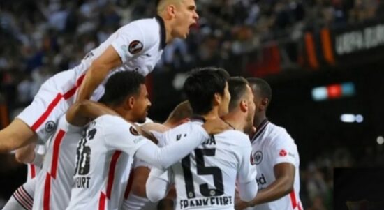 Para pemain Eintracht Frankfurt meluapkan kegembiraan. (Foto: Instagram @europaleauge) JAKARTA–Barcelona digulingkan Eintracht Frankfurt di perempat final Liga Europa 2-3 dalam laga kandang