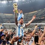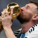 Lionel Messi mengangkat dan mencium tropi Piala Dunia. (fifaworldcup) JAKARTA – Bintang sepak bola dunia Lionel Messi akan terus membela Timnas Argentina