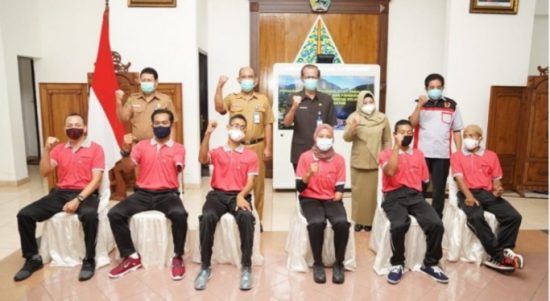 MAGETAN–Bupati Magetan Suprawoto didampingi Wakil Bupati Magetan Nanik Endang Rusminiarti memberikan pengarahan dan pelepasan atlet paralympic Provinsi Jawa Timur 2021, bertempat di