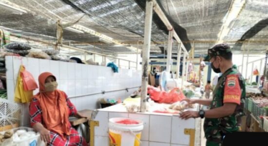 KARIMUN–Babinsa Meral Koramil 01/Balai Sertu Sutaswan menyambangi para pedagang Pasar Bukit Tembak, Meral untuk mendengar berkeluh kesah sekaligus untuk mengetahui dinamika dan
