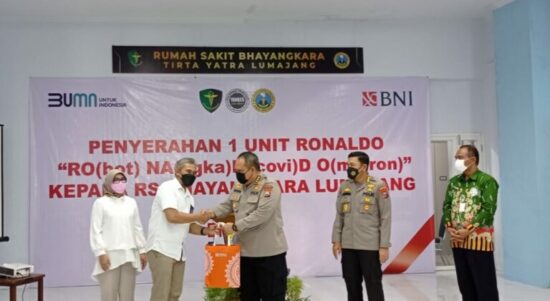 LUMAJANG–Rumah Sakit Bhayangkara Lumajang, Jawa Timur, menerima bantuan satu alat canggih atau mesin robot Ronaldo (Robot penangkal Covid Omicorn) dari Bank Negara