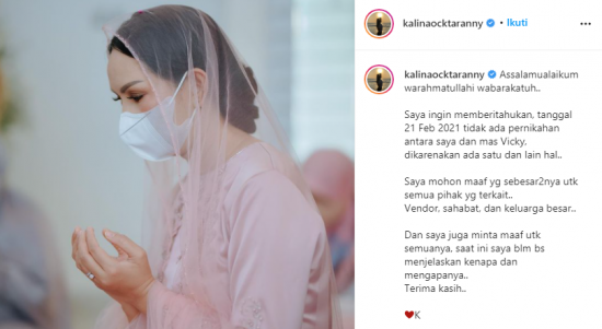 JAKARTA – Pernikahan antara Vicky Prasetyo dan Kalina Oktarani rencananya akan berlangsung bulan Februari ini. Tapi, tiba-tiba saja Kalina Oktarani mengumumkan batal