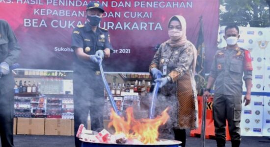 SUKOHARJO – Ribuan Barang Milik Negara (BMN) hasil penindakan Kantor Bea Cukai Surakarta dimusnahkan di halaman Kantor Setda Pemkab Sukoharjo, Selasa (30/11/2021).