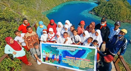 MISOOL – Belasan orang anak siswa Sekolah Dasar (SD) Negeri 17 mengikuti perekaman Kartu Identitas Anak (KIA) di ‘Puncak Love’ Misool, Raja