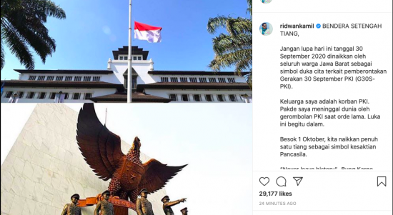 JAKARTA – Gubernur Jawa Barat (Jabar), Ridwan Kamil mengimbau seluruh warganya untuk menaikkan bendera setengah tiang pada hari ini (Rabu, 30/9/2020). Menurut