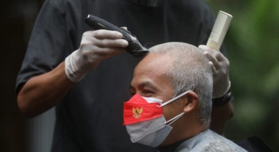 SEMARANG – Gubernur Jawa Tengah Ganjar Pranowo menepati janjinya cukur gundul dalam gerakan Berani Gundul 2022, Senin (28/2/2022). Cukur gundul dilakukan Ganjar