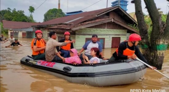 MEDAN – Setidaknya, 3.267 rumah warga Kota Medan, Sumatra Utara terendam banjir, Minggu (27/2/2022). Hasil pemantauan di lapangan, ketinggian muka air berkisar