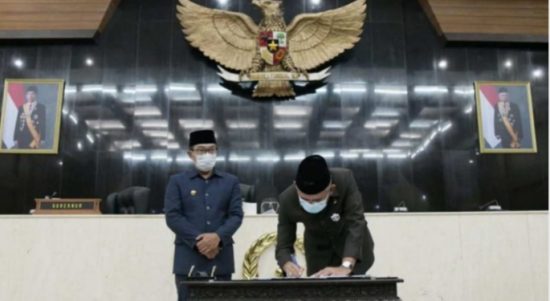KOTA BANDUNG–Gubernur Jawa Barat (Jabar) Ridwan Kamil menandatangani surat persetujuan bersama antara Pemerintah Daerah (Pemda) Provinsi Jabar dan Dewan Perwakilan Rakyat Daerah