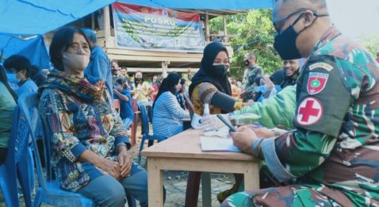 POLMAN–Puluhan anggota TNI Kodim 1402/Polman, Sulawesi Barat diterjunkan mengawal pelaksanaan vaksinasi di pedalaman. Kegiatan yang mengusung tema serbuan vaksinasi ini berlangsung di