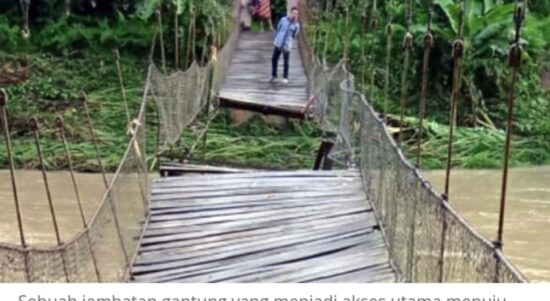 POLMAN–Jembatan gantung yang menjadi akses utama menuju Desa Lenggo, Kecamatan Bulo, Kabupaten Polewali Mandar, Sulawesi Barat, rusak parah diterjang Banjir luapan sungai.