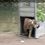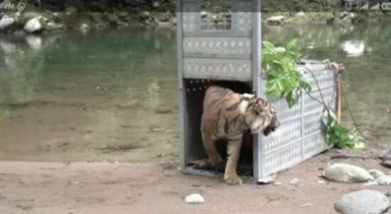 Satu dari dua harimau sumatera yang dilepasliarkan di TNKS. JAMBI–Dari tahun 2005 hingga 2021 ada individu harimau sumatera di kawasan Taman Nasional