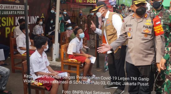 JAKARTA – Kepala Badan Nasional Penanggulangan Bencana (BNPB) sekaligus Ketua Satuan Tugas (Satgas) Penanganan Covid-19 Ganip Warsito meninjau vaksinasi di SDN Duri