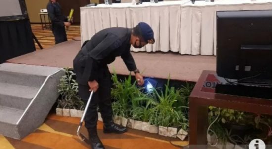 MEDAN–Satuan Brimob Polda Sumatera Utara menurunkan Tim Gegana untuk melakukan sterilisasi ruangan Rapat Pleno Terbuka rekapitulasi hasil pemungutan suara dan penetapan hasil