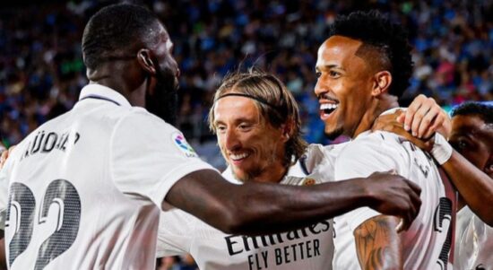 Eder Militao disambut Luca Modric dan Toni Ruediger setelah mencetak gol kemenangan Real Madrid atas Getafe. (Instagram @realmadrid) JAKARTA – Gol tunggal