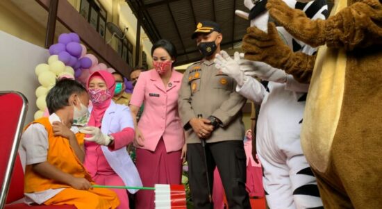 PROBOLINGGO–Polres Probolinggo mendatangkan gatotkaca dan badut serta arena bermain untuk menghibur sekaligus mengajak minat anak usia 6-11 tahun melaksanakan vaksinasi. Vaksinasi Merdeka