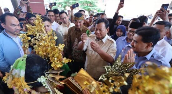 Calon presiden nomor urut 2 Prabowo Subianto (tengah) menghadiri acara Silaturahmi dan Deklarasi DPW Paguyuban Keluarga Besar Pujakesuma Provinsi Jambi di Abadi