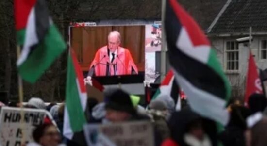 Sidang Mahkamah Internasional (ICJ) ditayangkan di jalan-jalan ketika demonstran pro-Palestina protes di dekat lokasi, di Den Haag, Belanda 11 Januari 2024. (REUTERS/Thilo