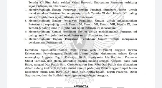 SUMBAR — Putusan Dewan Kehormatan Penyelenggara Pemilu- DKPP nomor 86- PKE- DKPP/ IX/2020 yang dibacakan, Rabu 4 November 2020 di Jakarta berisikan
