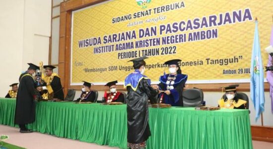 AMBON– Institut Agama Kristen Negeri (IAKN) Ambon Jumat (29/7/2022), melepaskan 57 wisudawan. Puluhan wisudawan tersebut terdiri dari 1 orang Doktor (S3) Program Studi Pendidikan