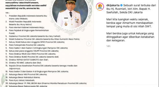 JAKARTA – Pemprov DKI Jakarta melalui akun Instagram mengunggah surat terbuka yang ditulis oleh Istri mendiang Sekretaris Daerah DKI Jakarta Saefullah, Rusmiati,