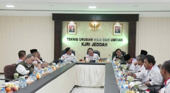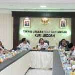 Rapat evaluasi menyeluruh pelaksanaan haji di Kantor Urusan Haji (KUH), Jeddah, Arab Saudi, Jumat (29/7). MAKKAH – Pelaksanaan haji tahun 2022 hampir