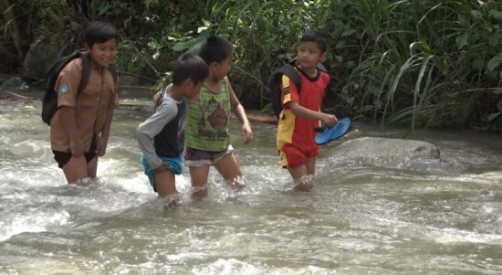 POLMAN–Murid kelas jauh Sekolah Dasar Negeri (SDN) 044 Desa Riso, Kecamatan Tapango, Kabupaten Polewali Mandar, Sulawesi Barat, harus bertaruh nyawa menyeberangi sungai
