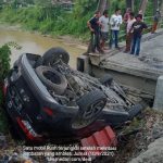 MEDAN – Sebuah mobil Toyota Rush hitam BK 401 HO terjungkal di jembatan yang amblas di Kecamatan Medan Tuntungan, Jumat (10/9/2021) sore.