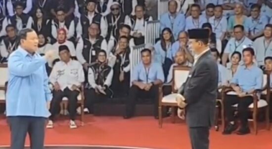 Prabowo Subianto dan Anies Baswedan berbalas tanggapan di debat capres pertama. (twitter) JAKARTA – Penampilan Prabowo dengan gaya jenaka ternyata membuat suasana