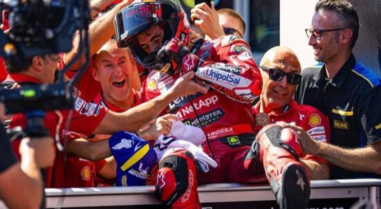 Pebalap Francesco Bagnaia disambut gembira tim Lenovo Ducati setelah memenangi Grand Prix Austria di Red Bull Ring, Spielberg, Austria, Minggu (20/8/2023). (Instagram