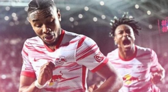 Ekspresi Christopher Nkunku usai mencetak gol kedua untuk kemenangan RB Leipzig. (Foto @rbleipzig) JAKARTA–Christopher Nkunku menghentikan laju Atalanta ke semifinal Liga Europa
