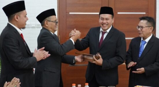 Pimpinan Rapat Pleno Anggota Badan Perlindungan Konsumen Nasional Radix Siswo Purwono dan Fitrah Bukhari menyerahkan palu sidang kepada Muhammad Mufti Mubarok dan
