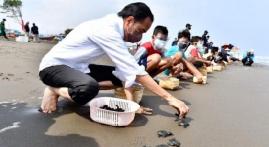 JAKARTA–Presiden Joko Widodo mengakhiri rangkaian kunjungan kerja di Kabupaten Cilacap, dengan melakukan kegiatan pelepasliaran tukik (anak penyu) di Pantai Kemiren, Kecamatan Cilacap