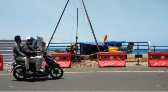 GIRI MENANG – Dua pria yang berboncengan di atas sepeda motor matic menurunkan kecepatan saat melewati salah satu lokasi longsor di kawasan wisata