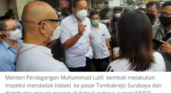 SURABAYA– Menteri Perdagangan Muhammad Lutfi kembali melakukan inspeksi mendadak (sidak) ke pasar dan distributor minyak goreng, di Surabaya, Jumat (18/2/2022). Temuan di
