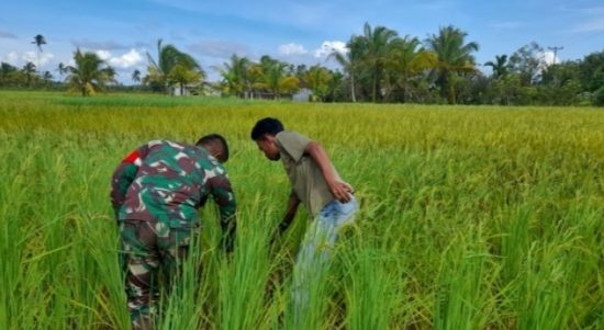MEMPAWAH – Bintara Pembina Desa (Babinsa) Koramil 1202-04/Sungai Kunyit, Serda Ali Mustakim turun ke sawah mendampingi petani mengecek perkembangan tanaman padi di
