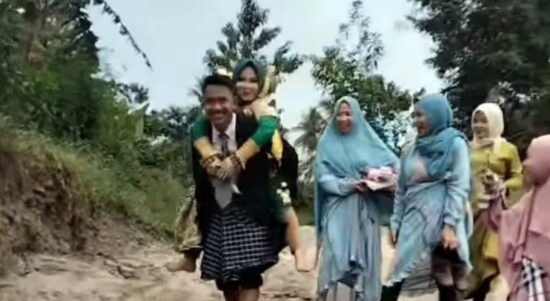 POLMAN–Seorang pria di Kabupaten Polewali Mandar, Sulawesi Barat, terpaksa menggendong istrinya menyeberangi sungai karena ketiadaan jembatan. Detik-detik aksi pengantin baru itu terekam