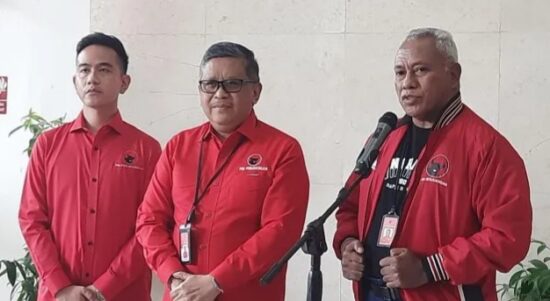 Wali Kota Surakarta Gibran Rakabuming Raka (kiri) bersama Sekjen PDI Perjuangan Hasto Kristiyanto (tengah) dan Ketua Bidang Kehormatan PDI Perjuangan Komarudin Watubun.