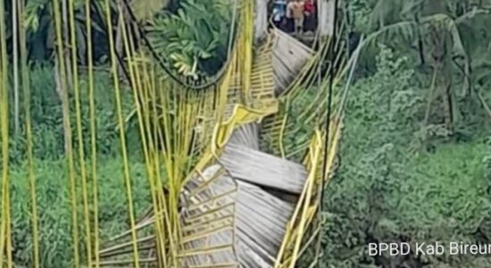 BIREUEN – Sebuah jembatan gantung yang menghubungkan dua desa.fi Kabupaten Bireuen, Aceh, putus, Senin (14/3/2022). Akibatnya belasan orang terjatuh ke sungai yang