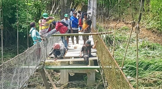 POLMAN – Perbaikan jembatan gantung, akses utama menuju Desa Lenggo, Kecamatan Bulo, Kabupaten Polewali Mandar, Sulawesi Barat yang rusak akibat diterjang Banjir