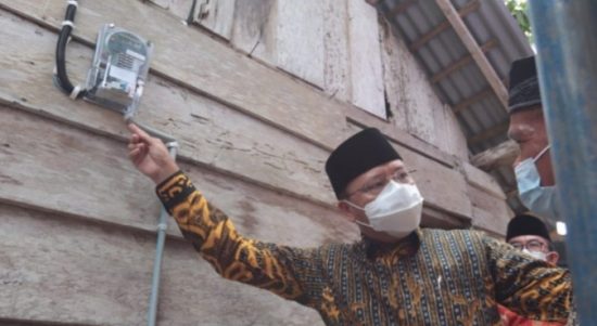 BENGKULU – Rumah berdinding papan kayu dan berlantai tanah milik Basiman, kini teraliri jaringan listrik. Listrik rumah tangga berkapasitas 450 volt ampere itu