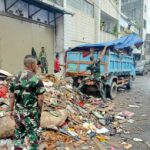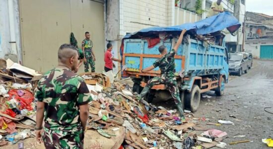 SERANG–Hari kelima pasca banjir di Kota Serang, Babinsa Koramil 0602-01/Kota Serang melanjutkan bersih-bersih di vihara, lingkungan Mangga Dua, dan Calung Kelurahan Kota Baru,