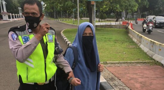 Setelah ditangkap Paspampres, perempuan bersenjata api diserahkan ke polisi lalu lintas yang bertugas di depan Istana. (Ist) JAKARTA – Komandan Pasukan Pengamanan