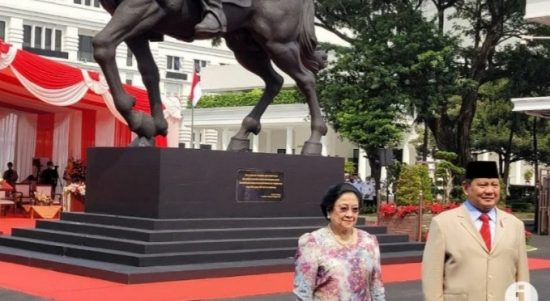 JAKARTA–Presiden Kelima RI Megawati Soekarnoputri dan Menteri Pertahanan (Menhan) RI Prabowo Subianto meresmikan patung Proklamator Soekarno sedang menunggang kuda, di halaman depan