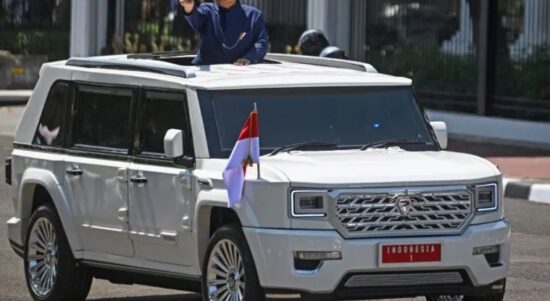Prabowo Subianto menaiki Maung yang menjadi kendaraan kepresidenan. (Antara Foto) JAKARTA — PT Pindad, produsen alat pertahanan dalam negeri, memulai produksi kendaraan taktis